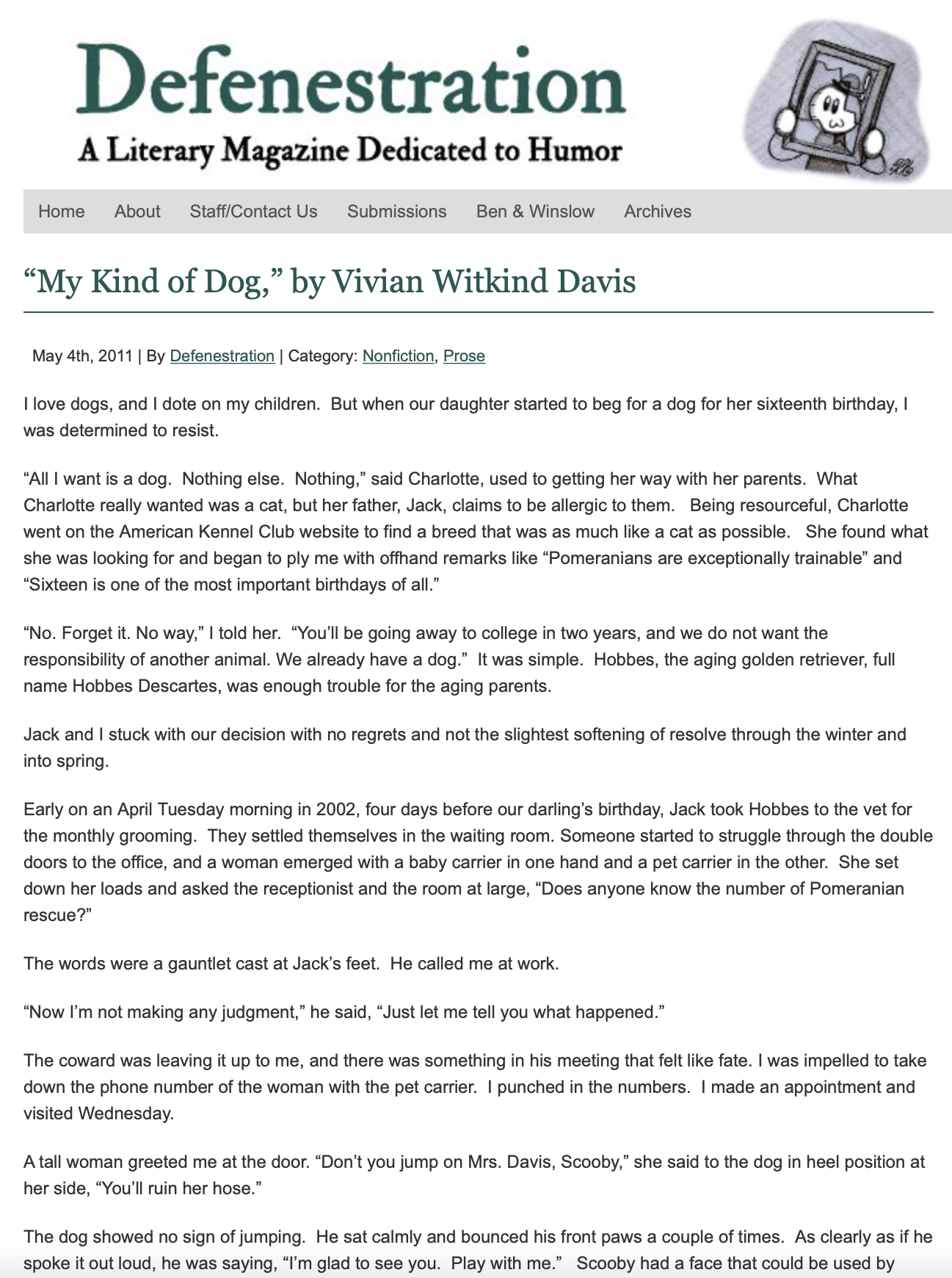 Vivian Witkind was born in New York City and lives in Blacklick, Ohio, with two Pomeranians. She has been a staff writer for Congressional Quarterly and a restaurant reviewer for Columbus Monthly. Always the keen diarist and letter writer, the author has written two memoirs and published several articles in journals of creative non-fiction since retiring from Ohio State University.